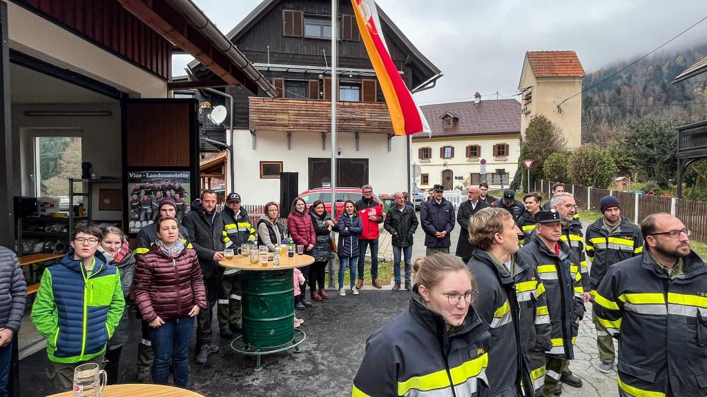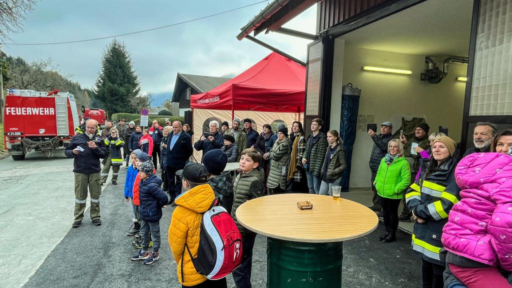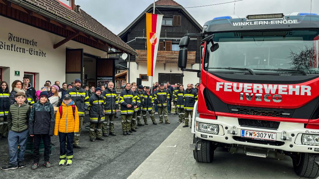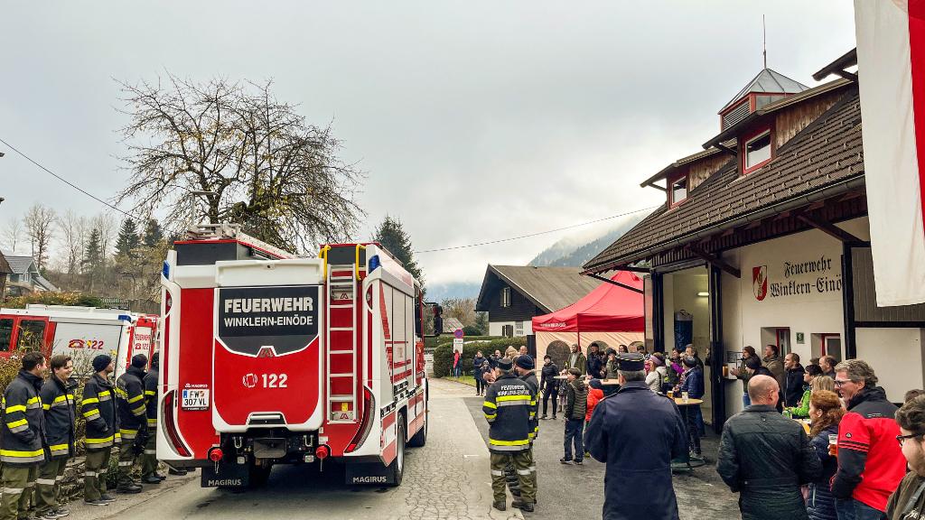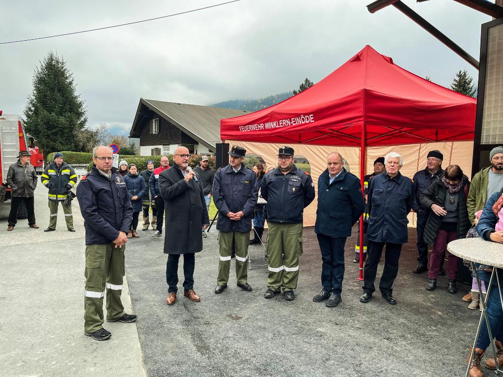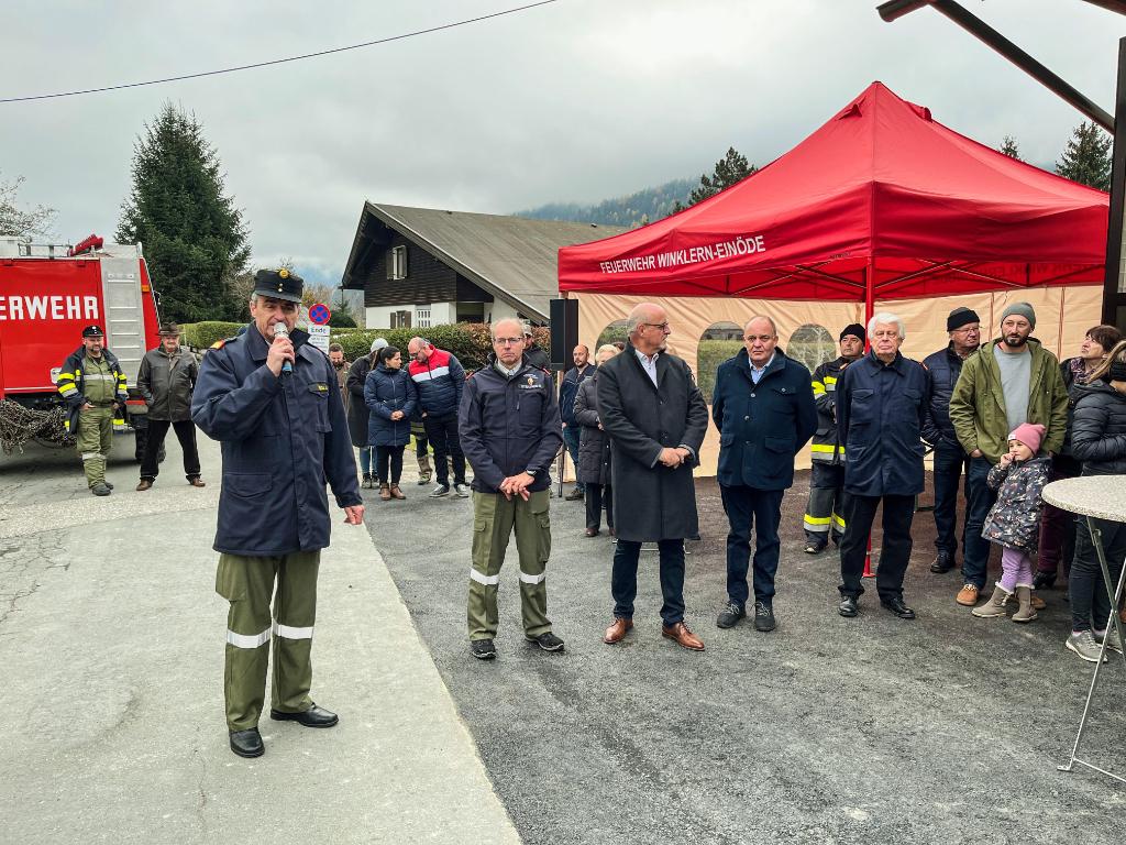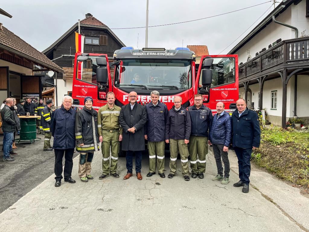 Am Rüsthaus angekommen, begrüßte Kommandant HBI Herbert Stefaner die Ehrengäste und die zahlreich anwesenden Gemeindebürger. Bezirksfeuerwehrkommandant OBR Libert Pekoll unterstrich in seinen Begrüßungsworten die Entscheidung der Stützpunktfeuerwehr Treffen, denen laut Gefahrenabwehr- und Ausrüstungsplanung (GAP-Kärnten) zwei Tanklöschfahrzeuge zustanden, aus einsatztaktischen Gründen das zweite Tanklöschfahrzeug in der Freiwilligen Feuerwehr Winklern-Einöde stationieren zu wollen. Eine in Kärnten erstmalige Entscheidung, deren Beispiel schon weitere Feuerwehren folgten. Nach weiteren Begrüßungsworten von Bürgermeister Klaus Glanznig wurde das neue Tanklöschfahrzeug der Kameradschaft übergeben und alle konnten das neue Fahrzeug in Augenschein nehmen.