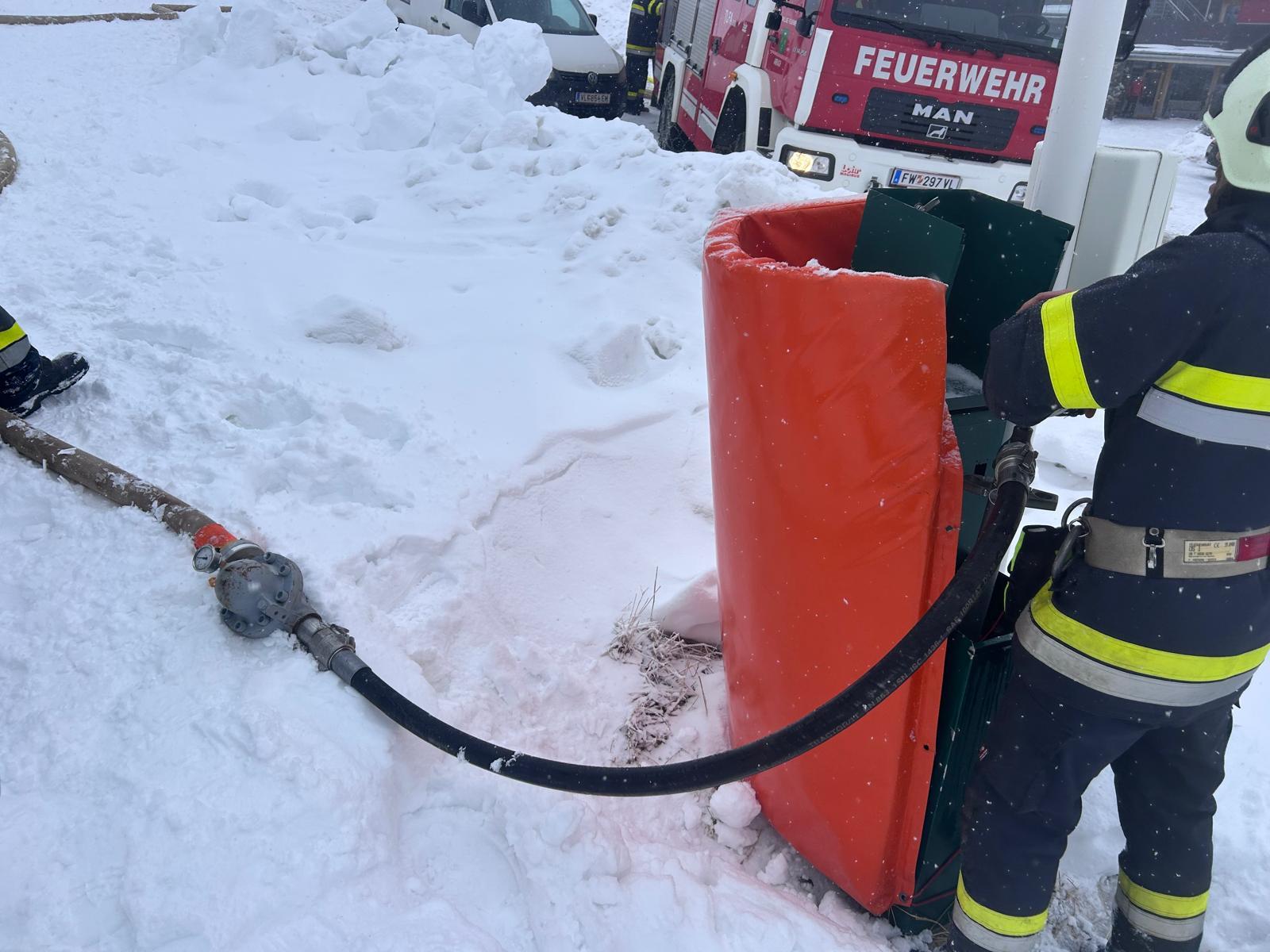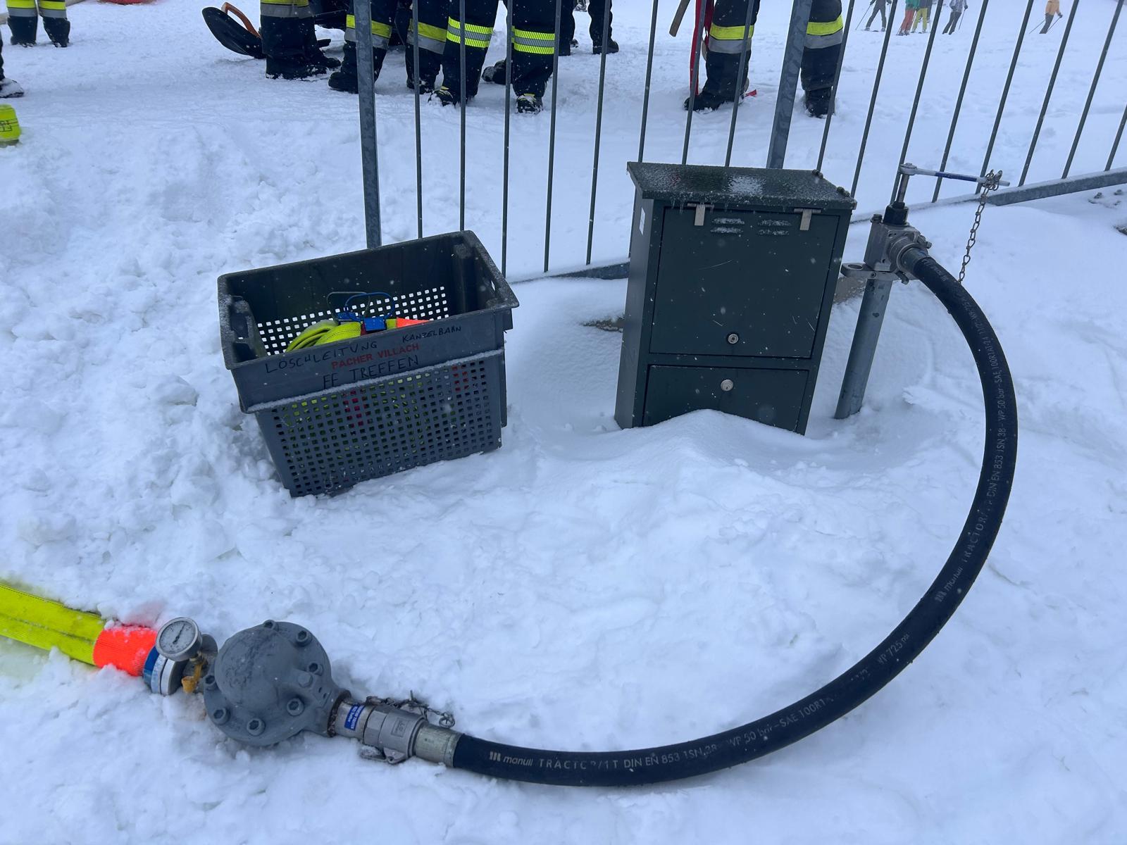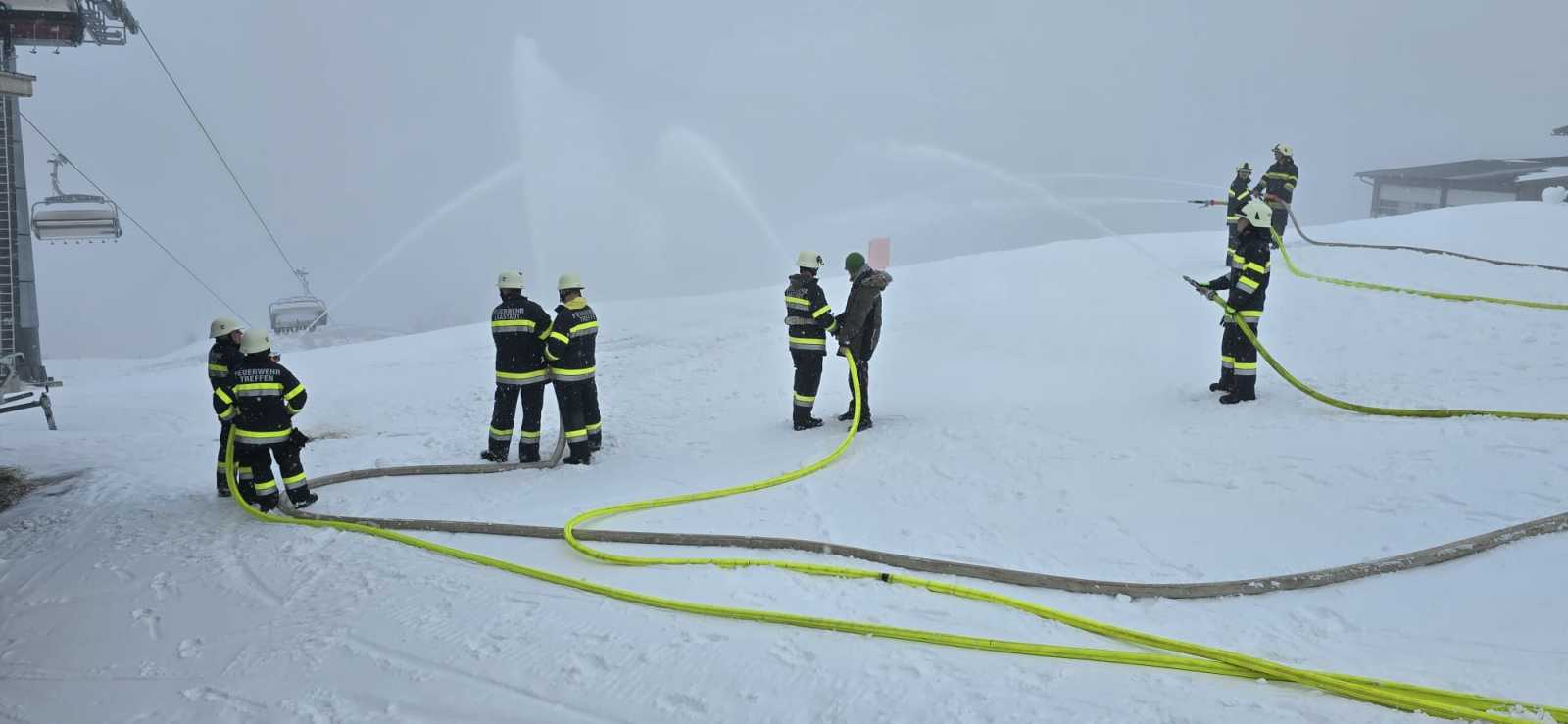 Ein kritischer Punkt war neben der Anfahrtszeit natürlich die Wasserversorgung. Diese konnte über die Beschneiungsanlage des Skigebiets Gerlitzen sichergestellt werden. Dabei galt es besonders, den hohen Wasserdruck der Anlage zu beachten, der deutlich über dem liegt, was im Feuerwehrdienst verwendet werden kann. Mithilfe spezieller Druckminderer wurde dieser Punkt praxisnah und einsatzrealistisch erprobt.
