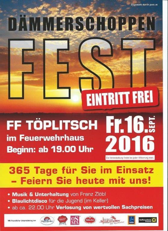 Die FF Töplitsch lädt am 16.09.2016 ab 19:00h zum Dämmerschoppen mit Blaulichtdisco ins Rüsthaus in Töplitsch. Um 22:00h findet eine Verlosung wertvoller Sachpreise statt. Die Lose sind bei allen Kameraden der FF Töplitsch erhältlich!